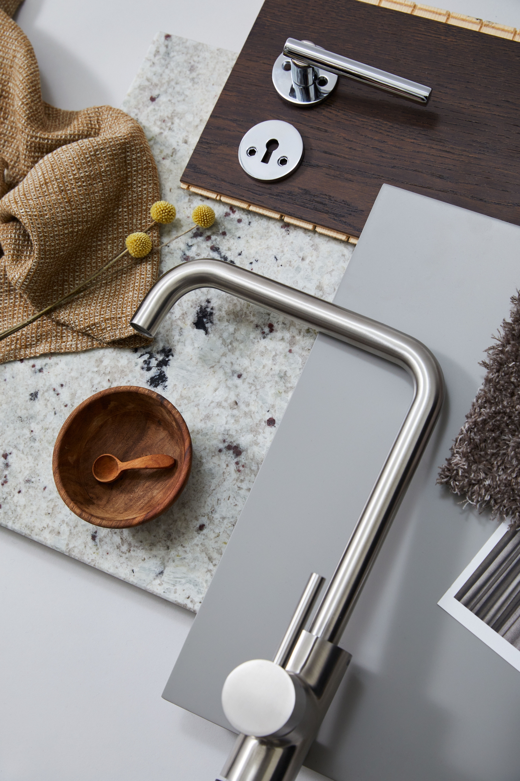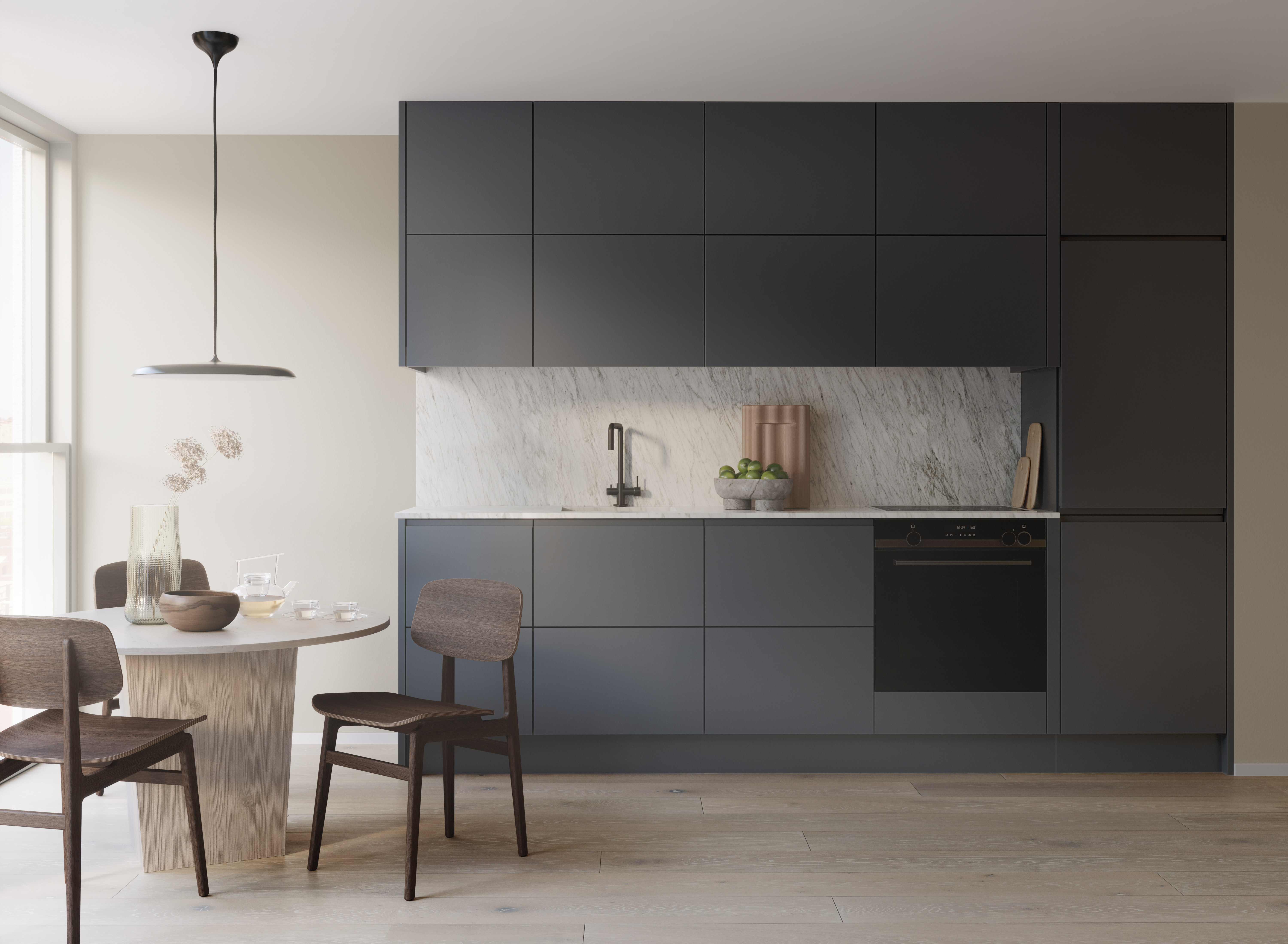 Lägenhetens snickerikök går i en tidlös och formren ton. Den takhöga inredningen kommer från familjeföretaget Taras Hallgren & Son och produceras i Partille. Designen är närmast minimalistisk med släta luckor och dolda grepplister. Lådorna är i massiv, mattlackad ek. Under överskåpen sitter spottar i borstat stål. Kyl, frys och diskmaskin är helintegrerade. Köket har även häll och ugn med möjlighet att välja till en kombiugn. Samtliga vitvaror är från Siemens och köksblandare från kvalitetssäkra Gustavsberg. Bänkskivor och stänkskydd i tidlös Carrara marmor eller ljus Colonial White granit med inslag av svart, vitt och silver. Allt i en fin balans mellan det aktuella och det tidlösa.