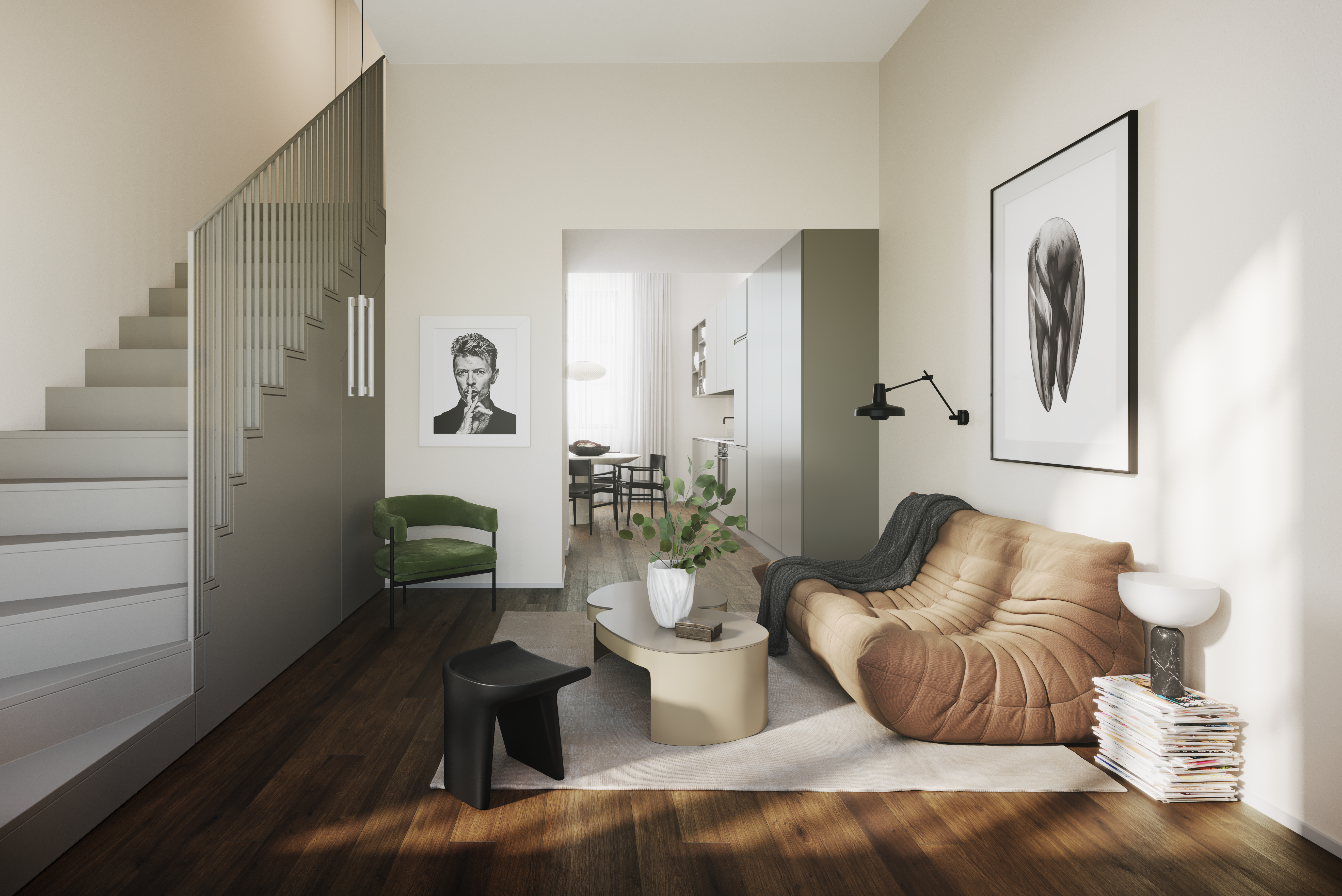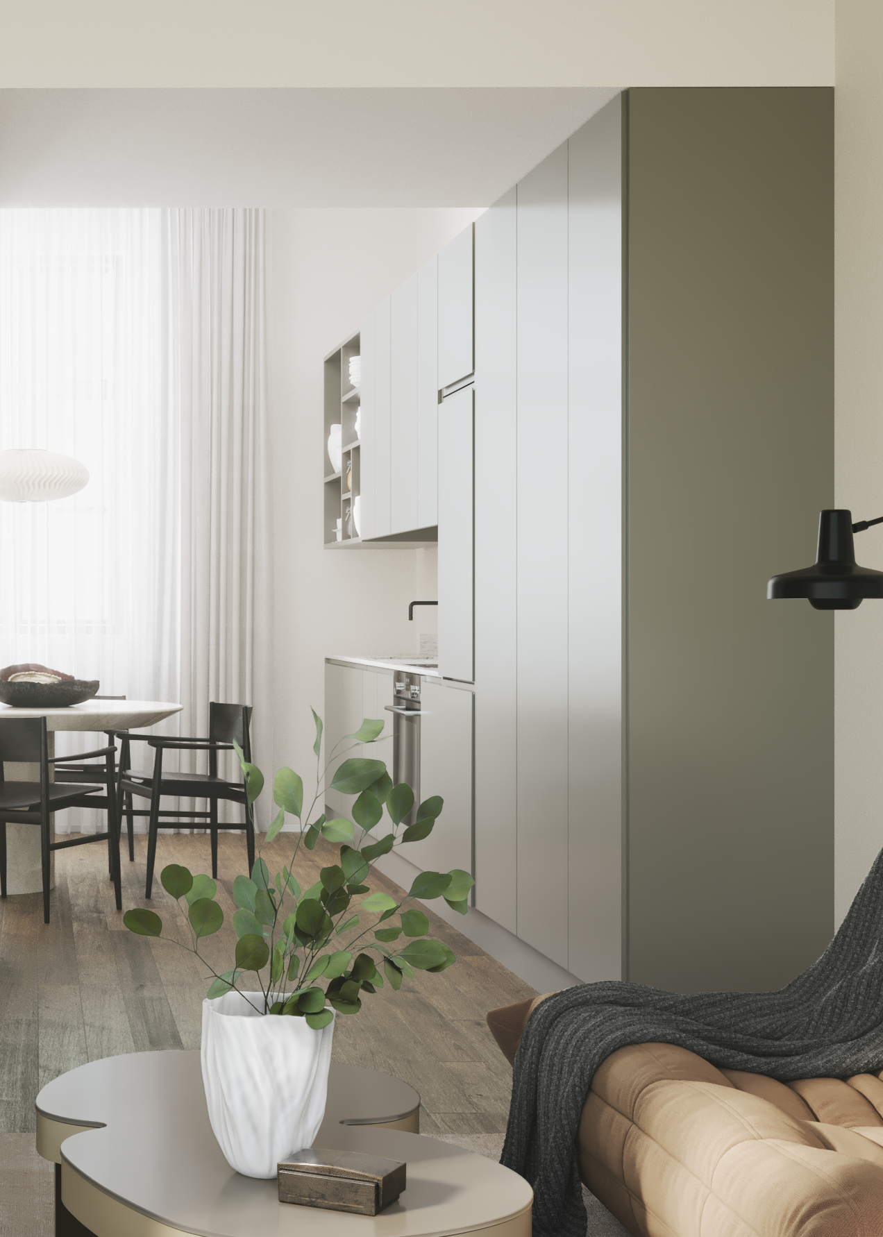 Det är gedigen bostadskvalitet med material som är förankrade i platsen och åldras med värdighet. Det är omsorgsfullt balanserade ytterligheter. Högt möter lågt. Hårda material möter varma ytor. Historia flätas samman med vår samtid.